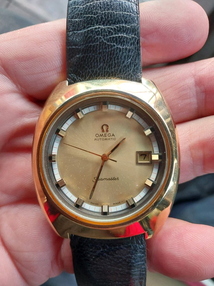 개인정보(거래정보)를 주고받는 행위는 사기에 노출될 수 있으므로 즉시 중고나라로 신고해 주세요오메가 씨마스터 300 빈티지 시계예요. 골드 케이스와 브레이슬릿으로 고급스러운 느낌이고, 뒷면에 오메가 로고가 선명하게 새겨져 있어요. 빈티지 제품 특성상 사용감은 있지만 작동 상태 양호합니다.