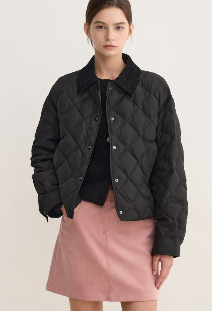 25 f/w신상 퀼팅 디테일과 코듀로이 소재가 조합된 칼라 구스다운 점퍼예요. 55사이즈 블랙 컬러로 어떤 스타일링에도 잘 어울리고, 따뜻하고 실용적인 아이템입니다. 택포49 환불X