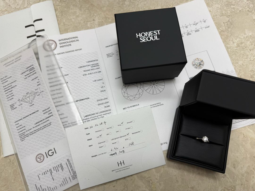 어니스트서울에서 제작된 랩그로운 다이아 반지입니다. 1캐럿 다이아몬드가 돋보이며, 14K 금 소재로 제작되었습니다. 링 사이즈는 10호로, 구매하실 분은 참고 부탁드려요. 문의 없으시면 바로 안전결제해주시면 됩니다! 200만원정도에 구매했었어요 보증서 있는 최상급 랩다이아예요