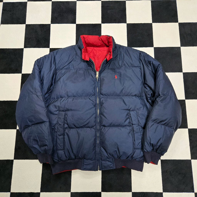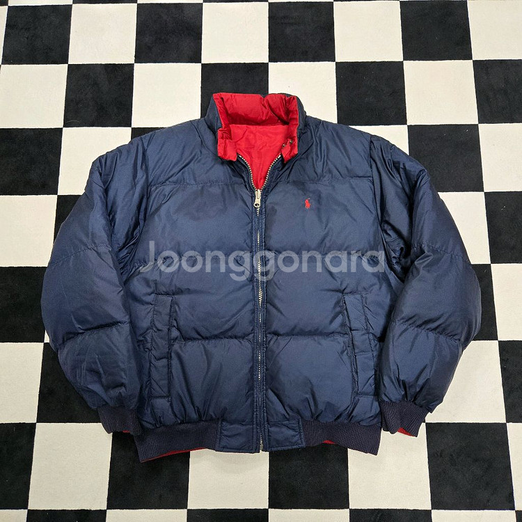폴로 랄프로렌 오리털 패딩점퍼 95사이즈예요. 네이비 컬러에 레드 안감으로 되어있고, 태그가 달린 새 상품 상태입니다. 따뜻하고 실용적인 겨울 아우터로 추천해요!