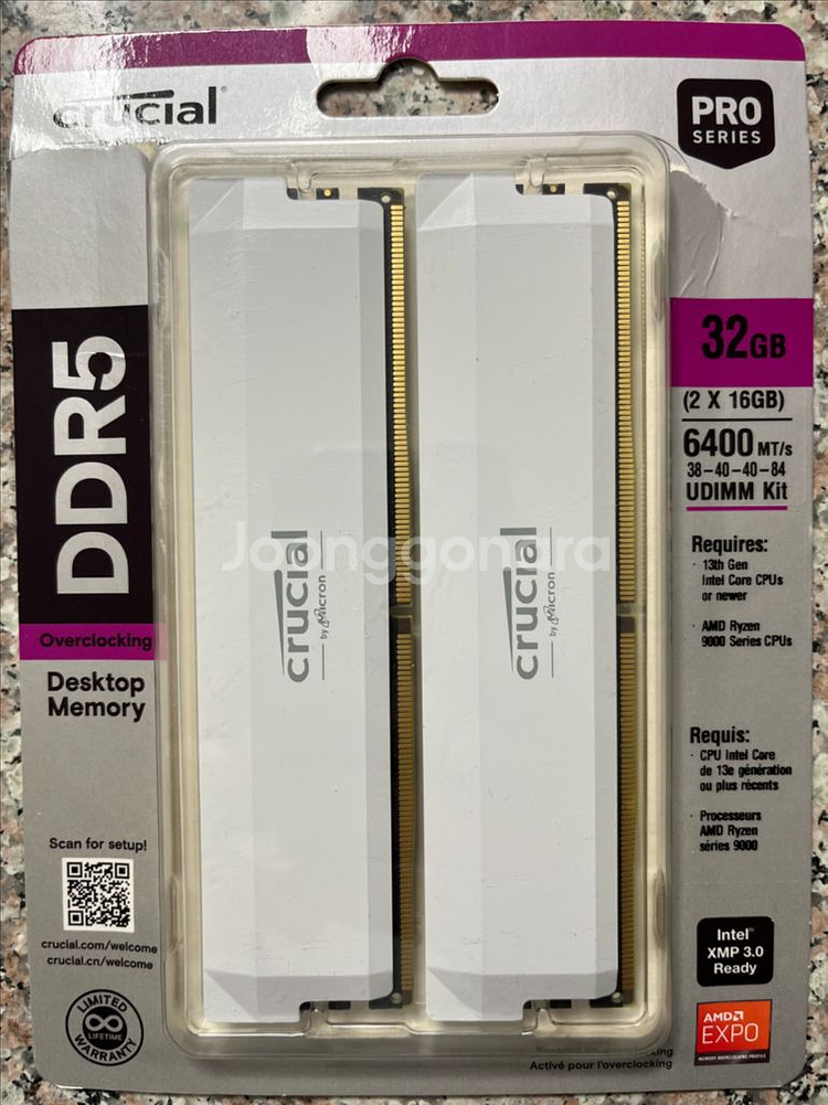 마이크론 Crucial DDR5-6400 CL38 PRO Overclocking White 패키지 (32GB(16Gx2)) 입니다 지난달 구매한 완본체에서 램 용량 업글하고 빼낸 제품입니다(해외직구 제품 아닙니다) 일이 바빠서 컴퓨터를 주말에만 잠깐 사용해서 실사용시간은 10시간 남짓입니다 프로파일이 6000/cl36 과 6400/cl38 두가지라 원하는 셋팅으로 사용하기 좋습니다 직거래는 청주에서 가능합니다
