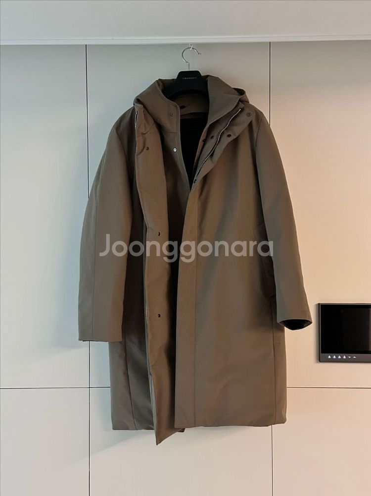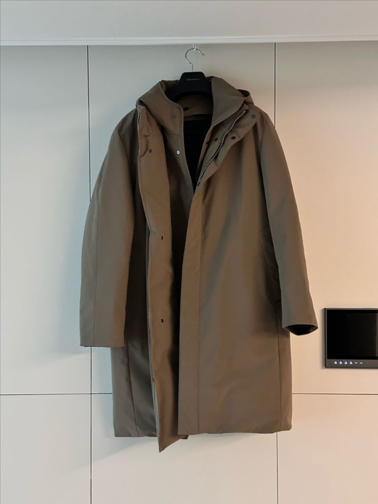 솔리드옴므 후드 롱 코트 패딩입니다 은은한 광택이 도는 재질이 고급스럽습니다 따뜻하고 퀄리티 정말정말 좋습니다 딱봐도 비싸 보입니다 후드부분 탈부착 가능하고, 색상은 카키 베이지입니다 거의 자차로 이동하다보니 입을일이 없어서 실착 2회 새상품 컨디션입니다 90만원대 구매했는데 반 가격으로 저렴하게 판매해요
