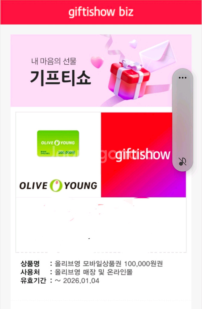 올리브영에서 사용 가능한 10만원 모바일 상품권이에요. 유효기간은 2026년 1월까지라서 빠른 거래 원해요!