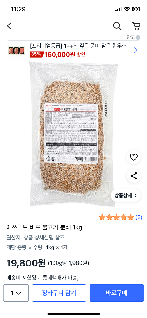 에쓰푸드 비프 불고기 분쇄 1kg입니다 소비기한은 2026년 3월 24일까지입니다