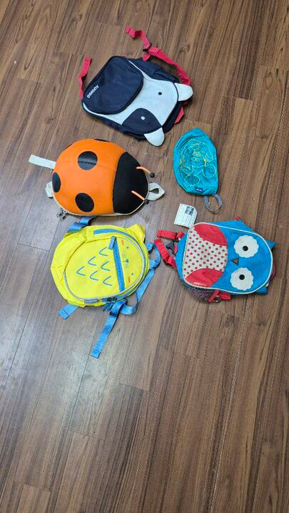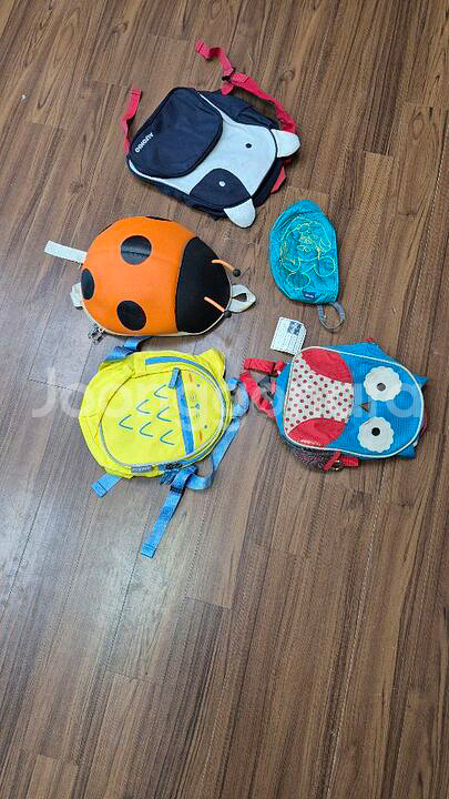 귀여운 동물 캐릭터가 그려진 유아용 파우치 5개예요. 개, 꿀벌, 오리, 오두막, 밤비 등 다양한 동물 디자인으로 구성되어 있고, 상태도 깨끗해 보입니다.