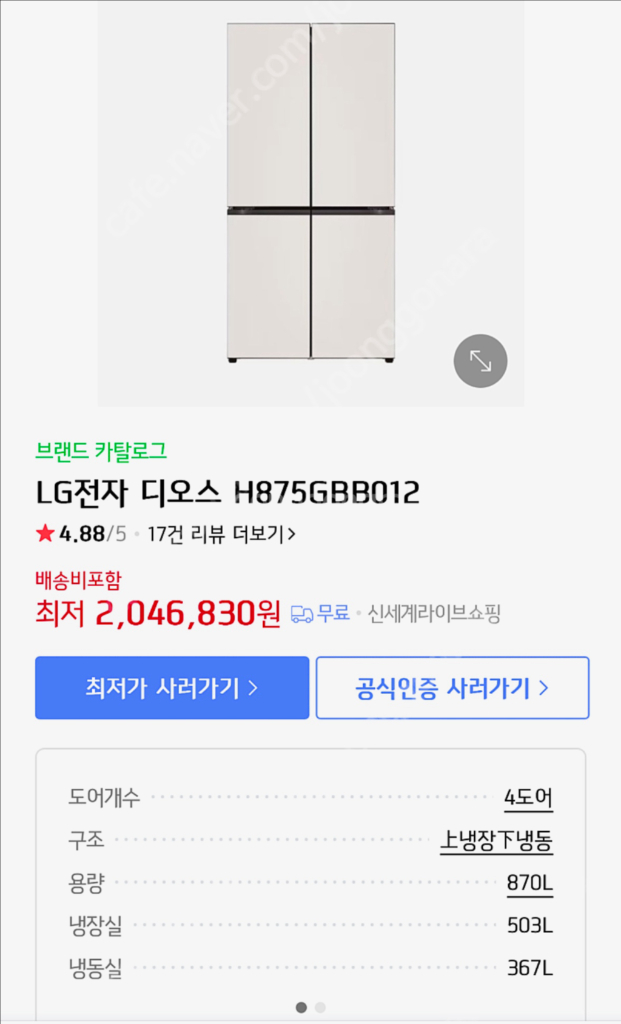 LG 디오스 오브제컬렉션 4도어 냉장고 870L