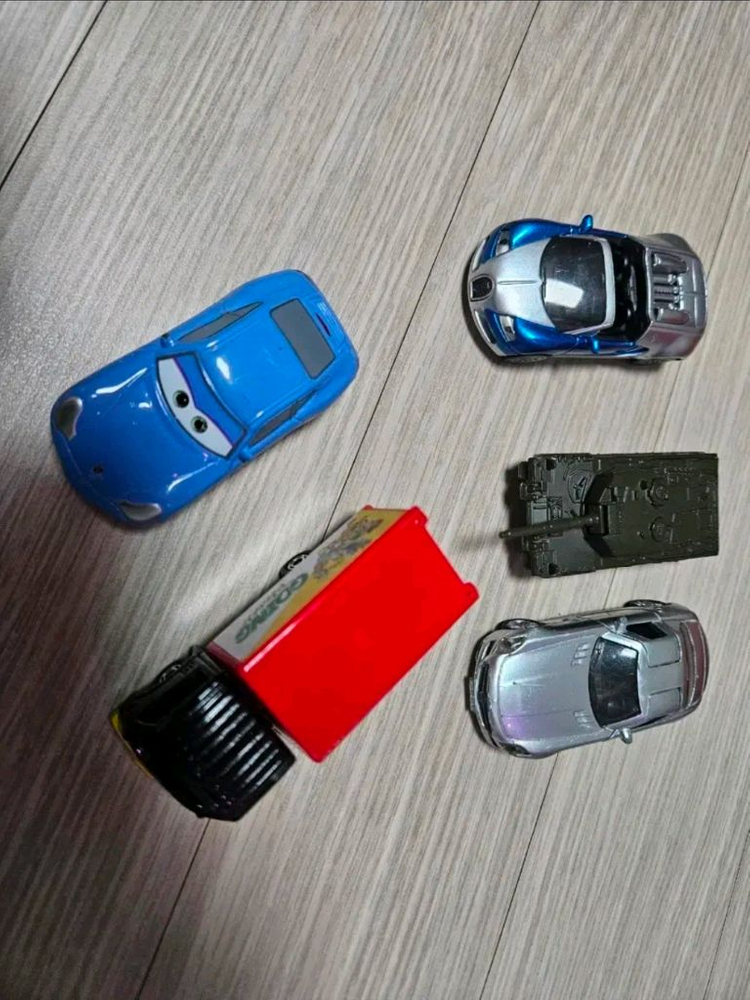 토미카 2개, 시쿠 3개 총 5대 미니카 세트입니다. 토미카는 파란색이랑 빨강/검정 트럭이고 시쿠는 은색, 파랑/은색, 전차입니다. 토미카 트럭 뒤에 덮개없어요 아이가 더이상 가지고 놀지 않아서 판매합니다. 사용감 조금 있어용 문의 없으시면 바로 안전결제해주시면 됩니다! 택포 1.3