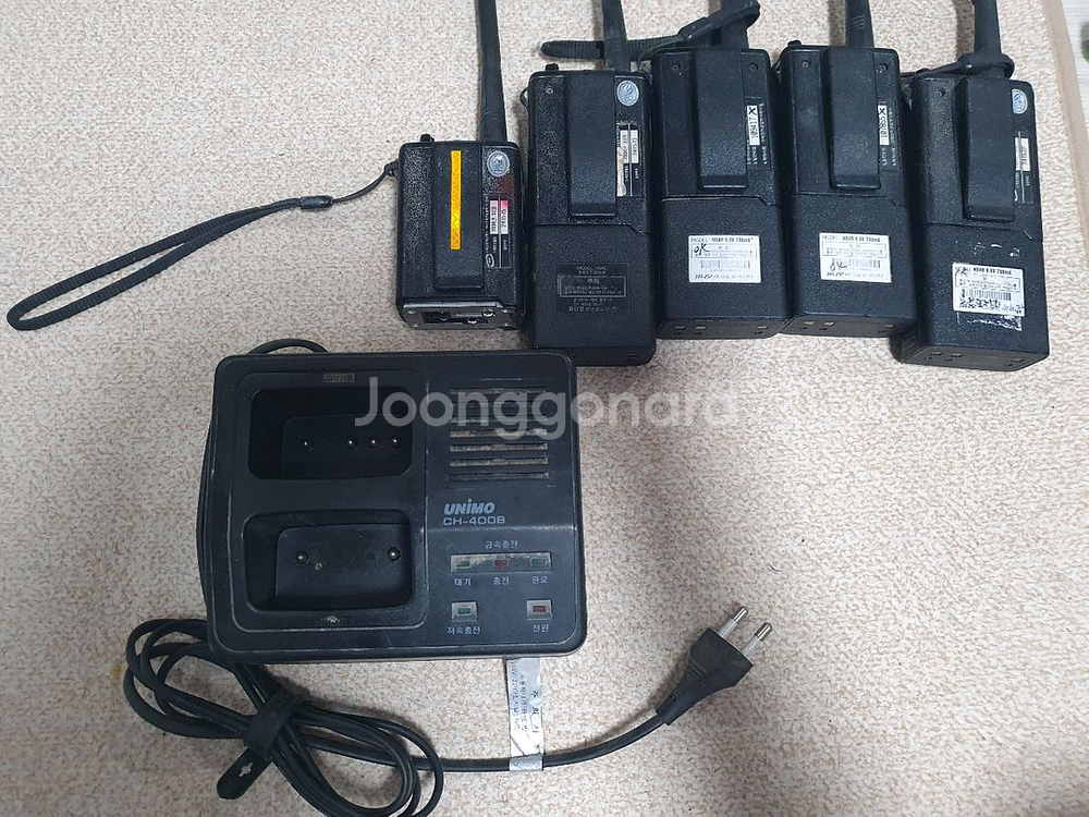 국산 무전기 유니모 5개 부품용 입니다. 배터리 1개 빼고 다 방전상태. 안테나 2개 크랙 본체 1개 전원 안들어옴 충전기는 정상배터리 1개로 테스트 하니 잘 되네요. 우체국 택비포함 4대 송수신 테스트 해보니 잘됩니다. 같은기종. 있거나 배터리 리필할줄 아시는분은 가져다 막쓰는 용도나 수신용으로 쓰셔도 될듯 합니다.