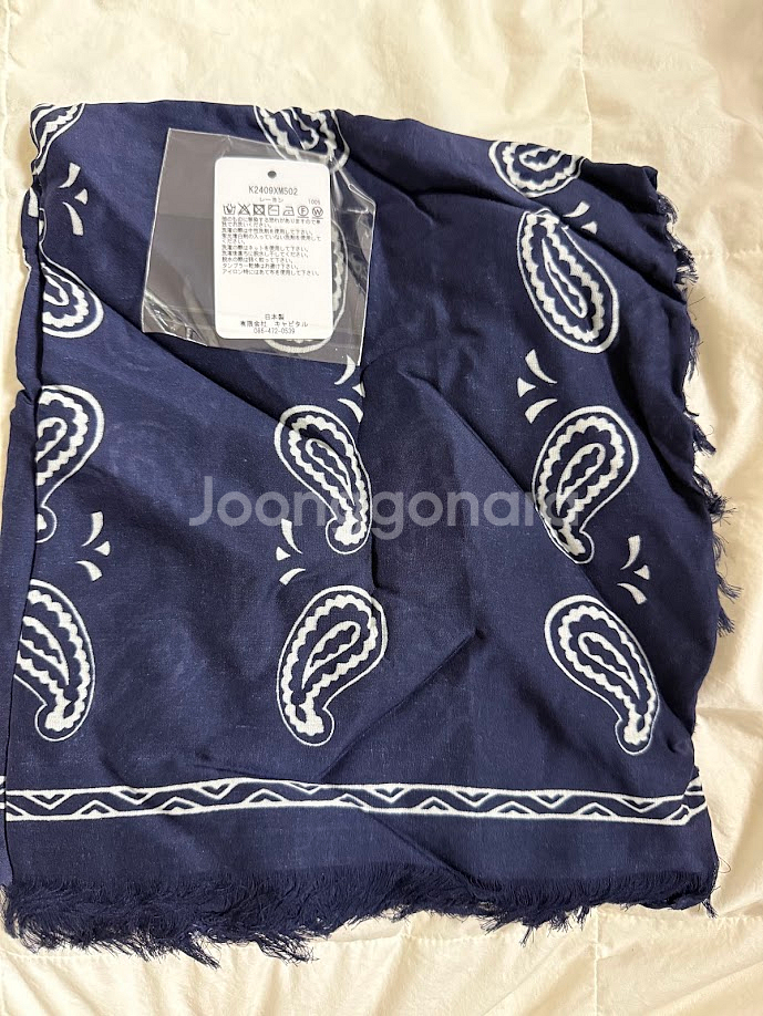 새상품 페이즐리 패턴 스카프예요! 태그 그대로 달려있고 네이비 바탕에 화이트 페이즐리 무늬가 고급스러워요. 프린지 디테일까지 완벽한 상태입니다. kapital 스카프