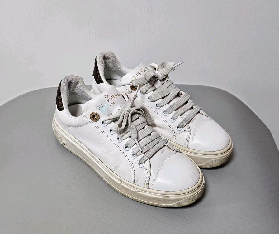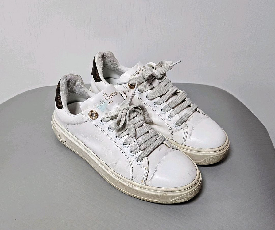 루이비통 타임아웃 화이트 스니커즈입니다 전체적으로 사용감 있으며, 밑창에 오염과 갈라짐 있어요 밑창만 수선보강하시면 신기 좋을거예요 뒷부분에 루이비통 로고가 있습니다 흰색 가죽 재질입니다 찔러보기 가격제시도 환영합니다