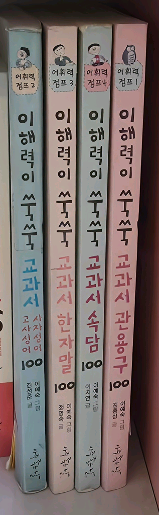사진에 보이는 '이해력이 쑥쑥 교과서' 시리즈 판매합니다. 어휘력 점프 1, 2, 3, 4 총 4권 있습니다. 고사성어, 속담, 한자말, 관용구 등 다양한 주제를 다루고 있습니다. 문의 환영합니다.