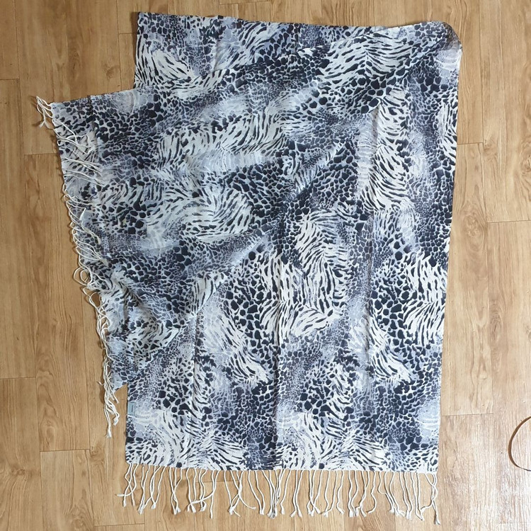 레노마(Renoma) 애니멀 패턴 숄/스카프 브랜드 Renoma (레노마) 종류 숄 / 대형 스카프 디자인 그레이·블랙 톤의 애니멀 패턴 (호피/지브라 믹스 느낌) 양쪽 끝 수술 디테일 소재 얇고 가벼운 촉감으로 면/레이온 계열 또는 모달 혼방으로 추정 사이즈 70.5 * 208CM 대형 숄 사이즈 (어깨에 걸치거나 목도리, 여름·간절기 숄로 활용 가능)