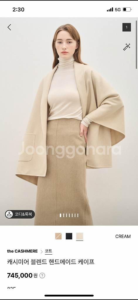 고급스러운 캐시미어 케이프예요. 크림 베이지 컬러로 어떤 옷과도 잘 어울리고, 코트처럼 걸치기 좋아서 활용도가 높아요. 24년 구매하고 보관만 했어요!