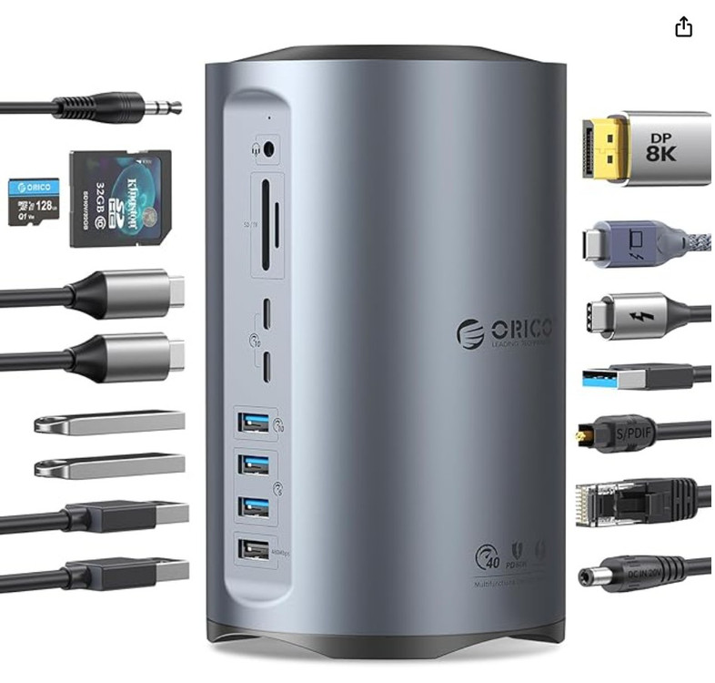 ORICO 오리코 썬더볼트 3 독 USB 멀티 포트 도킹 스테이션 팝니다. TB3-Y1 총 15개 포트 제공, PD충전(최대 60W), DP포트(8K@30Hz), USB-A/C 포트(최대 10Gbps), 기가비트 이더넷, SD/MicroSD 슬롯, S/PDIF 및 3.5mm 오디오 포트 최대 40Gbps의 초고속 데이터 전송을 지원하며, 듀얼 4K@60Hz 또는 싱글 8K@30Hz 디스플레이 출력이 가능 MacOS 및 Windows와 호환되며, 썬더볼트 포트를 지원하는 노트북에서 사용 가능 패키지에는 도킹 스테이션, 65W 전원 공급 장치, 40Gbps USB-C 케이블(1M) 등이 포함되며, 플러그 앤 플레이 방식으로 드라이버 설치 없이 사용 가능 사용하지 않은 제품이며 가격은 16.9 입니다. 구매 원하시는 분은 연락주세요 :) 서울 송파 강동 암사 직거래, 택배 가능합니다. 010-2888-5334