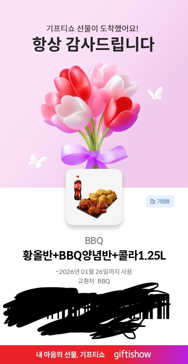 기프티쇼에서 받은 BBQ 기프티권 상품권이에요. 유효기간이 2026년 1월까지라서 빠른 거래 원해요!