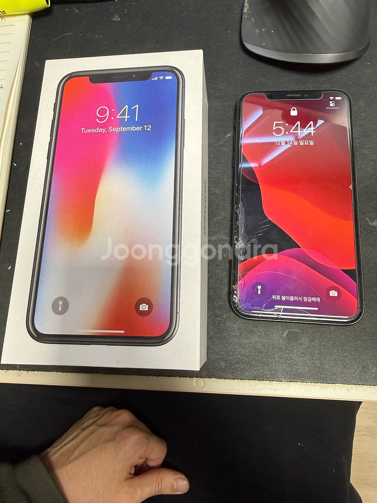 아이폰 X 스페이스그레이 64기가 팝니다. 박스 포함 가격입니다. 사진에서 볼 수 있듯이 전면 액정에 좌측 하단 파손된 부분과 뒷쪽 하단 좌측에도 깨져있습니다. 그 외 모서리 부분에는 생활 기스 있습니다. 카메라, 페이스아이디 등, 핸드폰 자체 기능에는 문제 없습니다. 배터리 효율 84%입니다. 직거래 선호하며 장소는 부천시 고강동입니다.