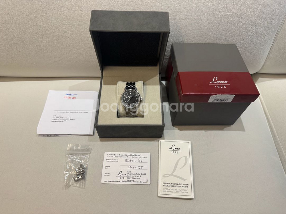 라코(Laco) 플리거 프로 37mm 판매합니다(정품) - 상태는 사용감 있는 중고 입니다. - 풀박스 구성 (박스, 보증서, 설명서, 여분 시계줄 포함) - 2년 보증 (구매일: 25년 2월 13일) - 모델 번호는 FL23883입니다 - Elabore 오토매틱 - 솔리드백 - 단면무반사 글라스 워낙 유명한 제품이라 시계 매니아분들은 잘 아시리라 생각 됩니다. 정가 176만원 이고 배송은 6주이상 걸리네요 판매가 125만원 입니다 근본 파일럿 워치를 경험해 보세요. 약간의 네고는 열어두겠습니다. 직거래는 대구 두류동 입니다. 쿨거래 택배 거래시 우체국 방탄포장 선불