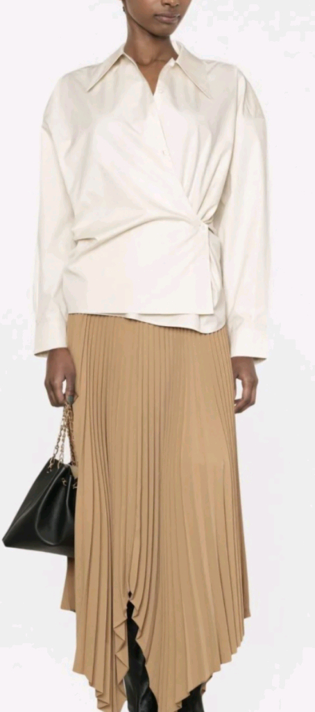 유명한 트위스트 셔츠 입니다 모델이랑 같은 옷입니다 색상은 사진의 아이보리색상이며 완판 했어요 신세계에서 구매했어요 34사이즈 한번 입고 명품드라이해서 보관중입니다 옷이 느무 많아 촘촘이 옷이 걸려있어 구김있지만 스팀해서 보내드릴께요~
