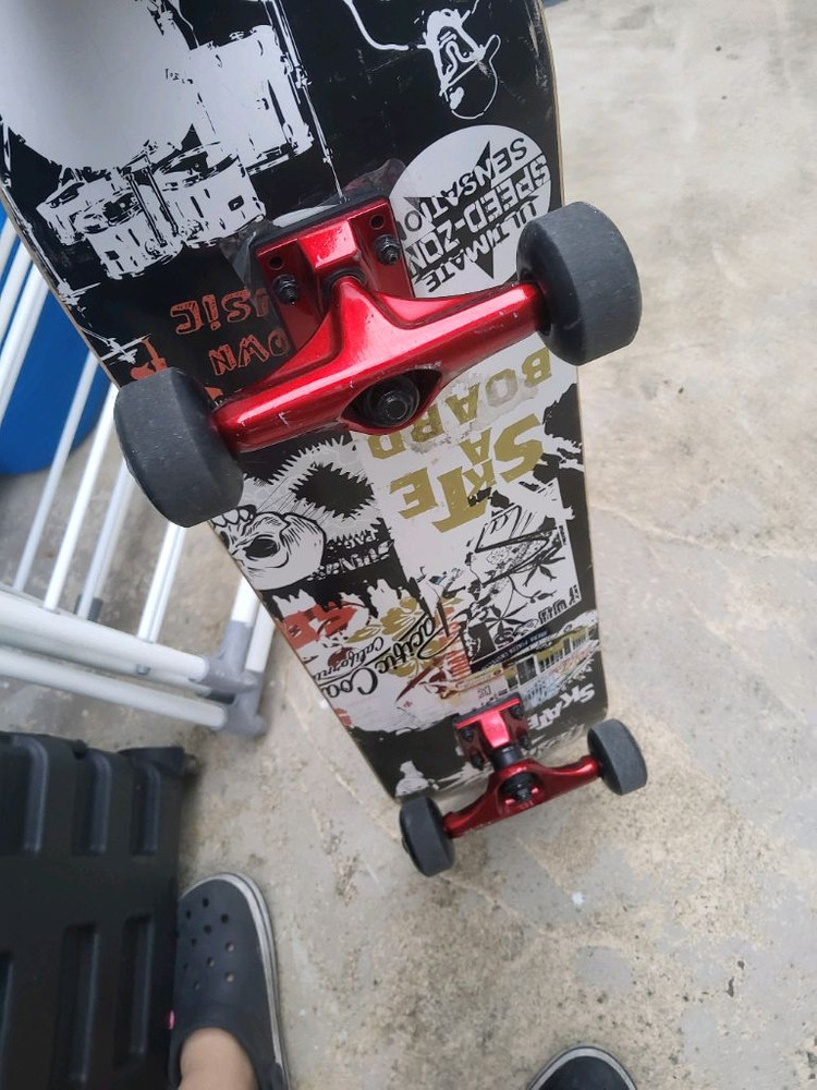 크로니 브랜드의 블랙 컬러 스케이트보드입니다. 사용감은 있지만 전체적으로 양호한 상태예요. 스케이트보드 입문용으로 좋을 것 같습니다.