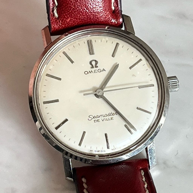 오메가 씨마스터 드 빌 빈티지 남성 시계 핸드 와인딩 33mm입니다. 직접 태엽을 감는 손맛이 있는 클래식한 1960년대 1960년 초반 수동 모델로 뒷면의 해마 로고 각인이 매우 선명하며 세월에 비해 상태가 좋은 편입니다. -1960년대 빈티지 시계 -수동 핸드 와인딩 -매우 작동 잘됨 -구성품 : 시계 본품 외 없음 -커스텀 소가죽밴드 레퍼런스 번호 확인을 위해 오메가 서비스 센터를 방문하였으나, 이 시계는 전면부(유리 및 베젤)를 통해 내부 무브먼트에 접근해야 확인할 수 있다고 합니다. 확인 과정에서 유리가 파손될 수 있다고 하셔서 그냥 왔습니다. 시계가 정상적으로 잘 작동되고 있어서요. 상태는 사진 참고해주세요. 직거래로만 판매합니다. 고민을 다 하시고 구입을 결정하신 분만 연락주세요. 중고품 특성상 환불이 불가하오니 참고 바랍니다 :)