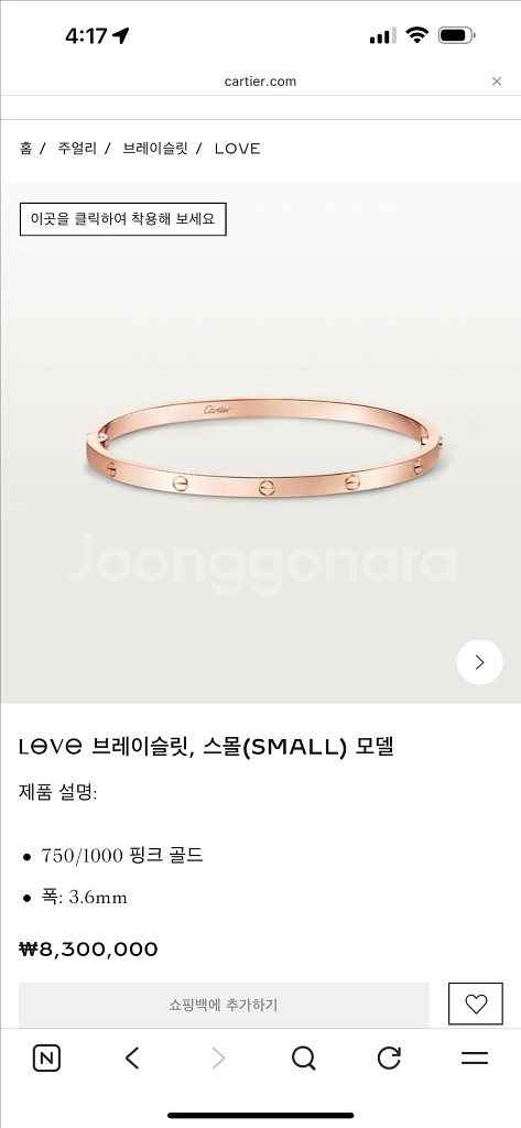 러브 브레이슬릿 스몰 로즈골드 17사이즈 박스, 쇼핑백, 보증서 등 구성품 풀셋 실착만해보고 보관만했어요 잠실 에비뉴엘 까르띠에 매장 구매