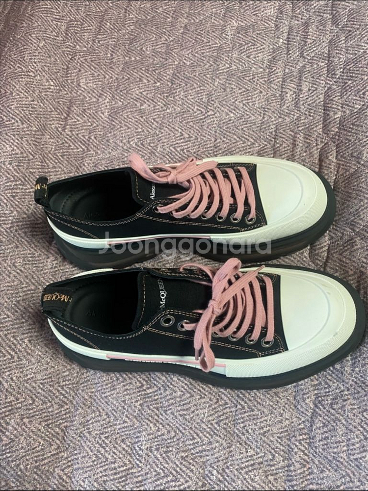 알렉산더맥퀸 블랙 스니커즈예요. 핑크 끈과 화이트 솔로 포인트를 준 디자인이 예쁘고, 전체적으로 깔끔한 상태입니다. 41 사이즈 이며 265 착용입니다. 1회 착용하고 쭉 보관만 했습니다. 신발이 너무 많아 박스는 버렸습니다. 정품 아닐시 100프로 환불 해드립니다.
