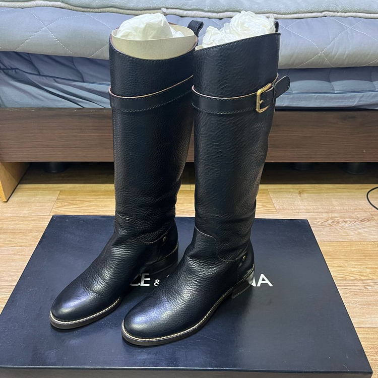 돌체앤가바나 블랙 레더 롱 부츠 35.5사이즈입니다. 은은하게 광택이 도는 고급스러운 가죽 소재입니다. 굽이 낮아서 착화감도 편할 것 같아요. 사진 참고해주시면 될 것 같아요! 데일리로 착용하기 좋습니다 추가 사진 원하시면 문의바랍니다! 택배비 선불 4000원 추가입니다