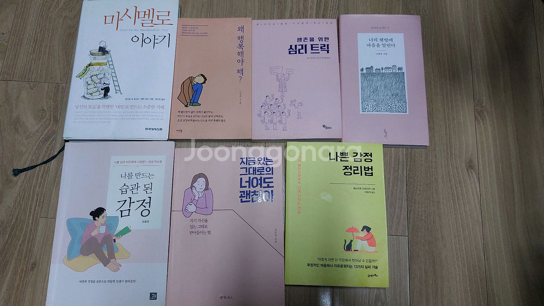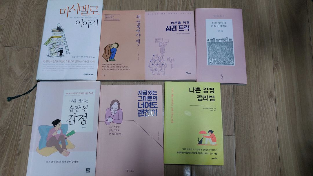 심리도서 각 3천원(1~6번) 1.마시멜로 이야기(완료) 2.왜 행복해야해? 3.생존을 위한 심리트릭 4.나를 만드는 습관된감정(완료) 5.지금 있는 그대로의 너여도 괜찮아 6.나쁜감정 정리법(완료) 7.너의 햇볕에 마음을 말린다 나태주 시집 - 5천원 한두번읽고 보관중이라 세월의 흐름있는것도 있지만 대체로 양호합니다 낙서찢김없습니다 2번 6번은 물기젖은 흔적약간있어요 서울 강서 직거래가능(연락시 상세주소전송) 택배+4천원 반값 +2500원(gs25만가능) 에눌시 답변없이 차단 변심환불불가