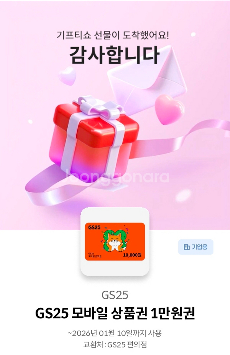개인정보(거래정보)를 주고받는 행위는 사기에 노출될 수 있으므로 즉시 중고나라로 신고해 주세요GS25에서 사용 가능한 1만원 모바일 상품권이에요. 2026년 1월까지 사용 가능하니 빠른 거래 원해요!