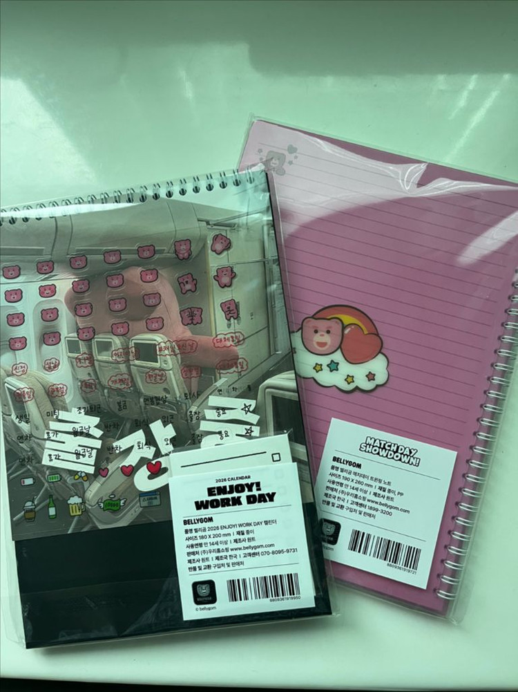 벨리곰 2026년 캘린더와 노트 세트입니다 - 귀여운 벨리곰 캐릭터 디자인이 돋보여요 - 새상품 그대로 비닐 포장되어 있습니다 - 캘린더는 책상에 두고 사용하기 좋은 사이즈입니다 - 다이어리 꾸미기 스티커로 활용 가능합니다