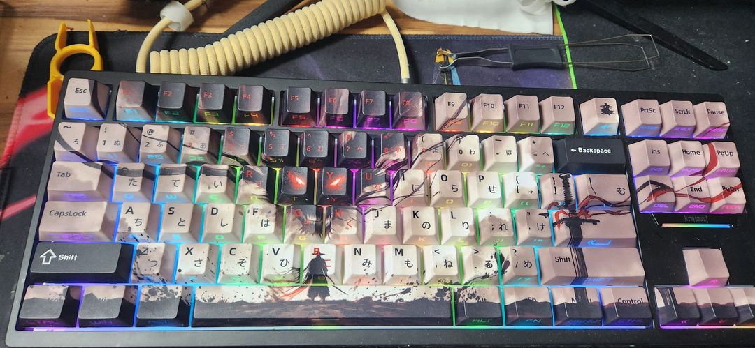독특한 디자인의 커스텀 기계식 키보드입니다 키캡 디자인이 독특하고 예뻐요. 현재 장착되어있는 키캡은 가나가와 대파도 키캡이고 3만원에 구매했습니다. 원래 키캡은 재질하나는 좋습니다.(근데 생긴게 맘에 안들어용 ㅠㅠ) 스위치는 유도축입니다(에포메이커 87 한정 스위치고 엄청 비싸요) 35g 입니다.*자석축 상위호환계열 알류미늄 하우징이고 구매는 35만원에 했어요. 폼레스트랑 항공케이블도 드립니다! 상태 매우좋아요. 타건음 듣고싶으시면 연락 부탁드릴게요 반려동물 x 흡연 x