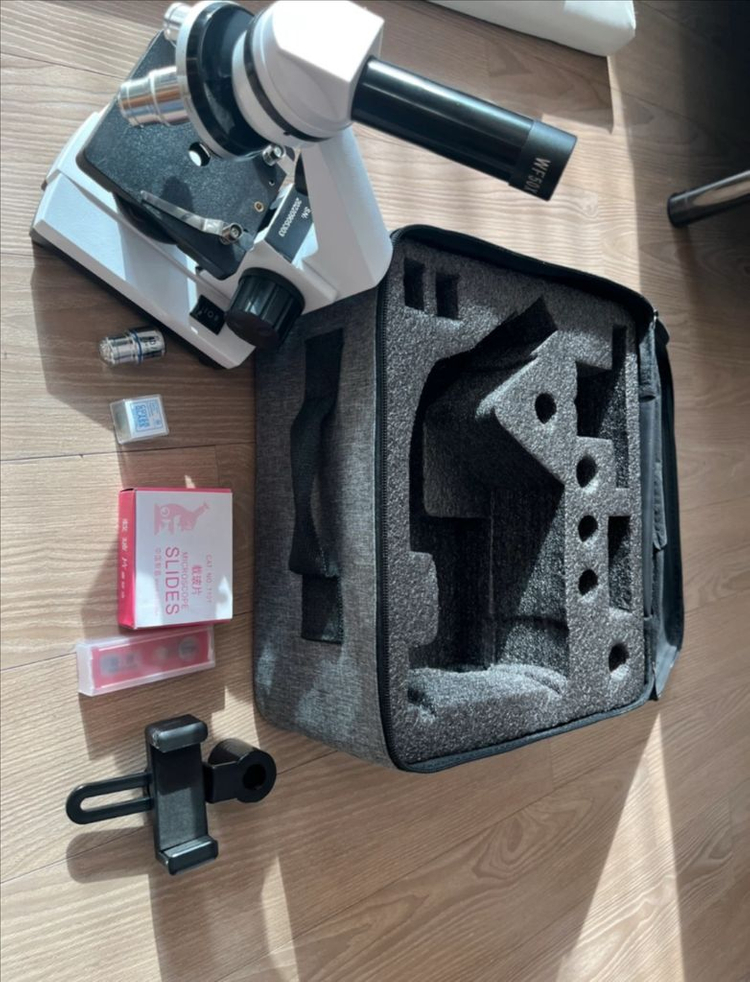 휴대용 보관 케이스, 슬라이드 글라스, 커버글라스, 표본 4x 10x 40x 100x 대물렌즈 접안렌즈, 휴대폰 촬영용 거치대 포함 풀 구성입니다. 정상작동 확인했습니다ㅎㅎ 해운대역 직거래시 3만원 택배거래시 3.5만원입니다
