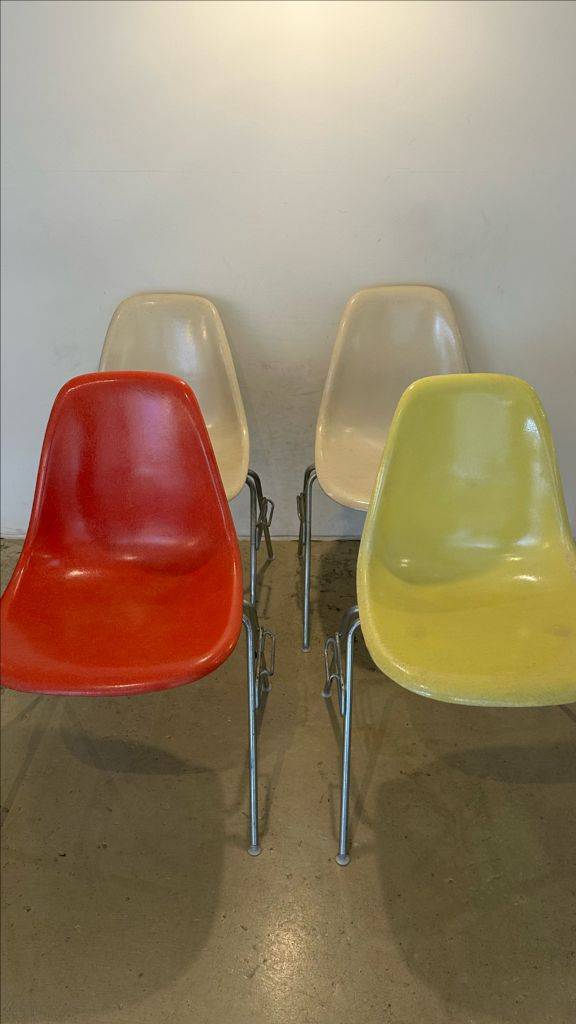 임스 파이버글라스 체어 4종 입니다. 레몬, 레드오렌지, 크림2종 체어 상태는 좋습니다 (크랙 없음) 부싱 교체도 있고 다리발 부분 교체도 있습니다(신품) (임스부싱삭음으로 교체) 크림체어 1개는 다리 검정으로 교체 (루밍에서 정품으로 구입 화이트가 없어서) (사진참고) 임스는 세월 지나면 부싱 다리발이 문제인데 그런한 부분들을 교체 진행 했습니다. 빈티지 가구를 이해하시는 분들이 가져가셨으면 합니다 일괄시 210 (배송비 별도) 개별 60 (배송비별도)