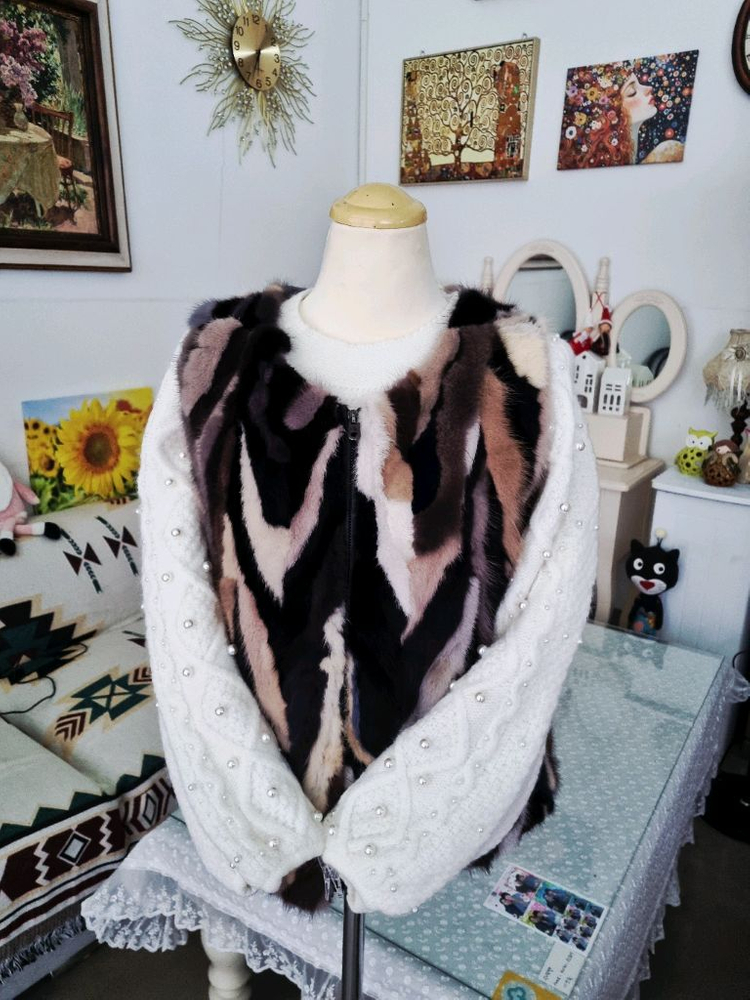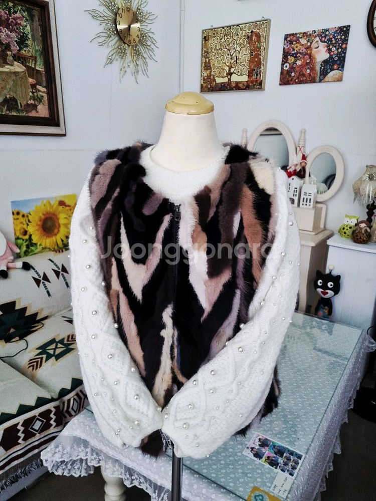 고급스러운 퍼 카라가 포인트인 니트 가디건이에요. 브라운과 베이지 톤의 퍼와 화이트 니트 소재가 조화롭게 어우러져 있어서 세련된 느낌을 연출해줍니다. 상태 양호하고 겨울철 데일리룩이나 오피스룩으로 활용하기 좋을 것 같아요.