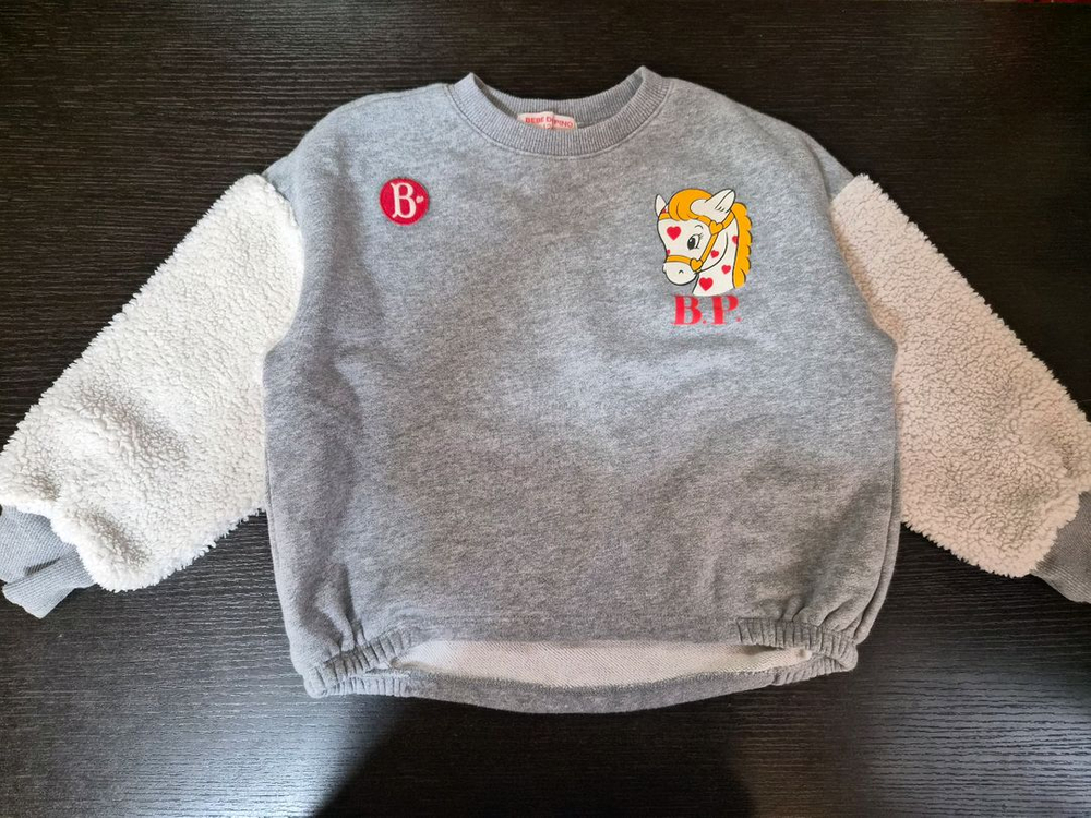 120 사이즈.. 뽀글이 소매라 겨울에 패딩조끼랑 입혀도 예뻐요.. 톡톡한 쮸리원단이라 세탁후 변형없고 활동하기 좋아요.. 얼룩 오염없고 상태 좋습니다..