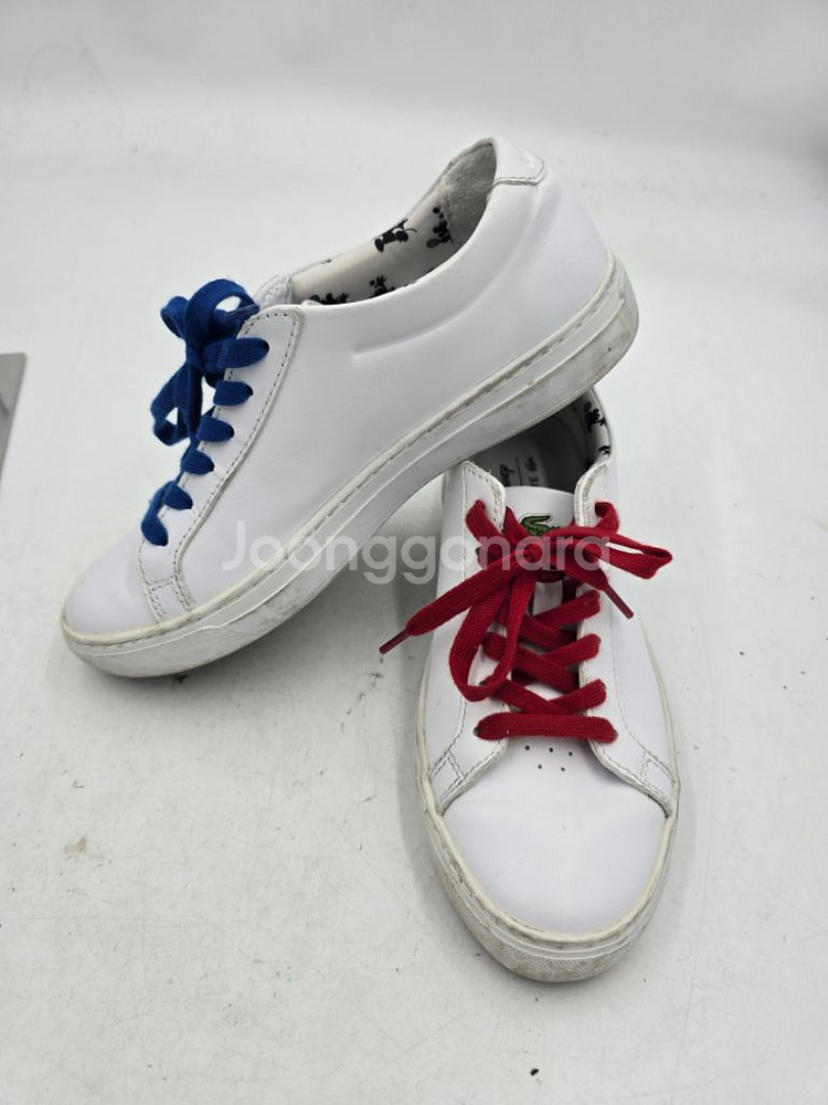 라코스테와 디즈니 콜라보 스니커즈에요 미키마우스 디자인이 귀엽습니다! - 브랜드: 라코스테(Lacoste) - 콜라보: 디즈니(Disney) - 모델: 미키마우스 스니커즈 - 색상: 흰색 - 신발 끈 색깔: 파란색, 빨간색 - 사이즈: 235(36) - 상태: 사진에서 보이는 것처럼 사용감 조금 있어요