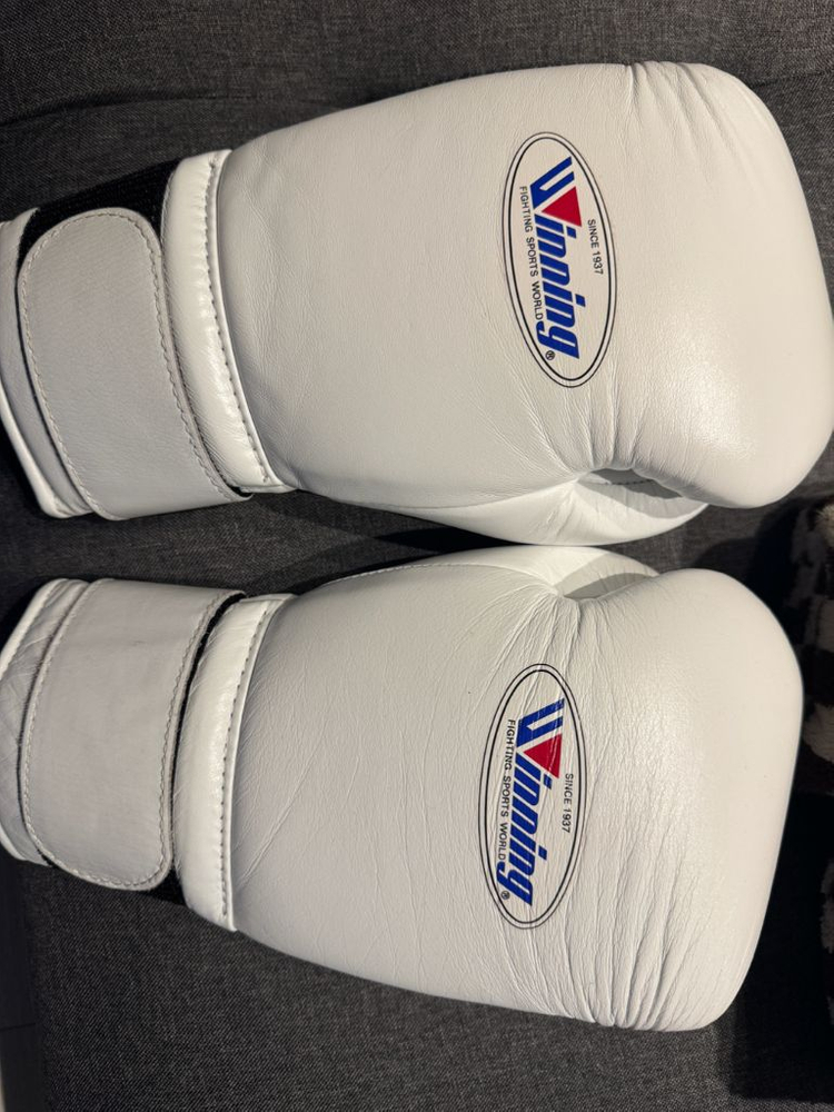 위닝 브랜드 14온스 복싱글러브입니다. 화이트 컬러로 깔끔하고 사용감 별로 없고 상태 양호해요. 얼마사용 안한 제품입니다