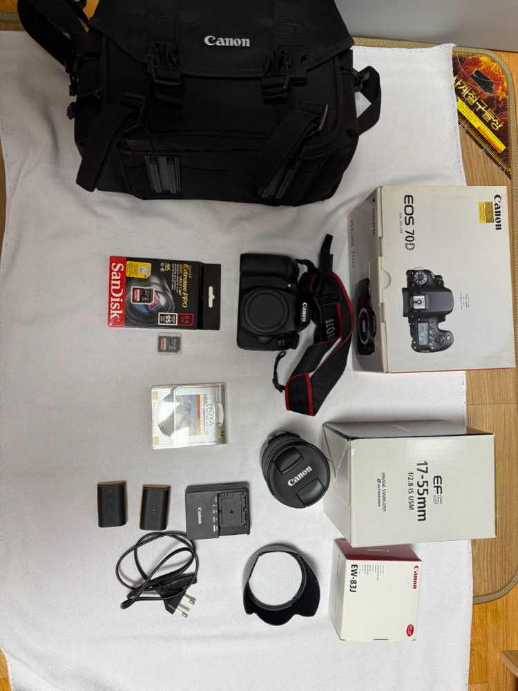 개인정보(거래정보)를 주고받는 행위는 사기에 노출될 수 있으므로 즉시 중고나라로 신고해 주세요캐논 70D 바디와 EF-S 17-55mm 렌즈가 함께 있는 세트입니다. 박스와 구성품들이 모두 포함되어 있고 많이 사용하지 않고 스크래치 없는 S급 제품입니다.