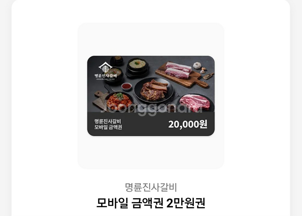 개인정보(거래정보)를 주고받는 행위는 사기에 노출될 수 있으므로 즉시 중고나라로 신고해 주세요명륜진사갈비에서 사용 가능한 2만원 모바일 금액권이에요. 유효기간 확인 후 구매해주세요! 채팅남겨주세요 2026.11.23일까지입니다. 글안내렸으면 안팔린거에요^^
