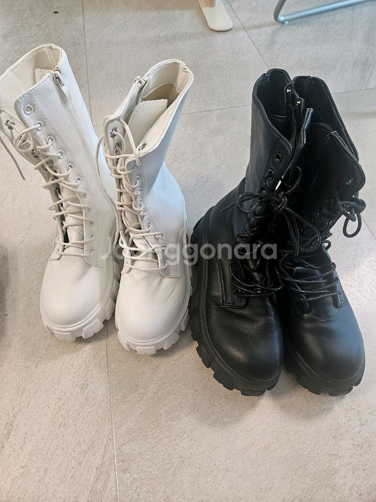 개인정보(거래정보)를 주고받는 행위는 사기에 노출될 수 있으므로 즉시 중고나라로 신고해 주세요여성용 통굽 워커 부츠 화이트, 블랙 2족 세트예요. 깔끔한 디자인으로 데일리 코디하기 좋고, 댄스 무대 할때만 잠깐 신어 깨끗합니다 사이즈 225. 바닥에 35로 표기되어 있습니다 쿠팡에서 구입했어요 2켤레 일괄 배송비3000원