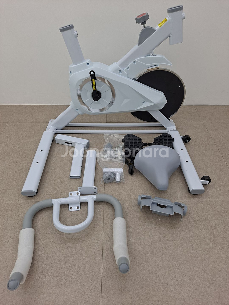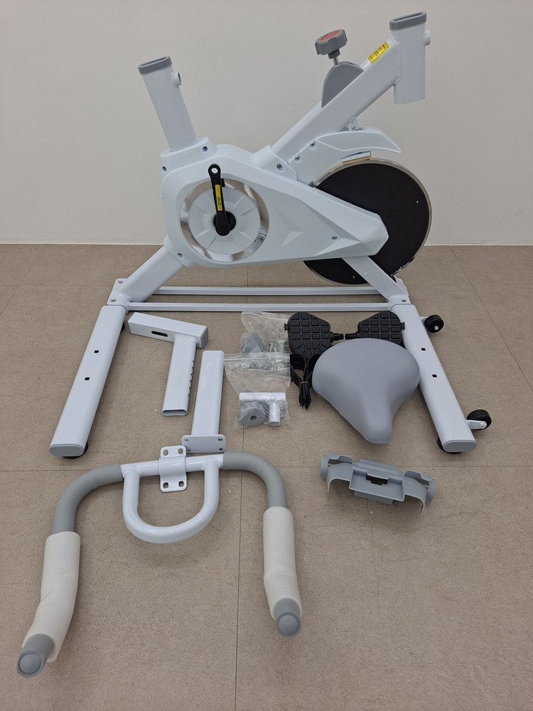 - 실내자전거 - 색상 : 화이트 - 사이즈 : 85 x 47 x 105 cm - 무게 : 20KG - 부하용량 : 150KG - 기능 : 무한저항조절 / 7홈 무소음벨트 / 좌석핸들 높이조절 / 스테인리스 스틸 / 스마트폰거치가능 / 블루투스연동 / 롤러이동수납 등 - 어플을 활용해 기록을 잴 수 있는 부품도 포함해서 드립니다. - 새제품입니다만, 손잡이 부분이 박스 포장때문인지 조금 눌려있습니다. 사진 참고 부탁드려요.