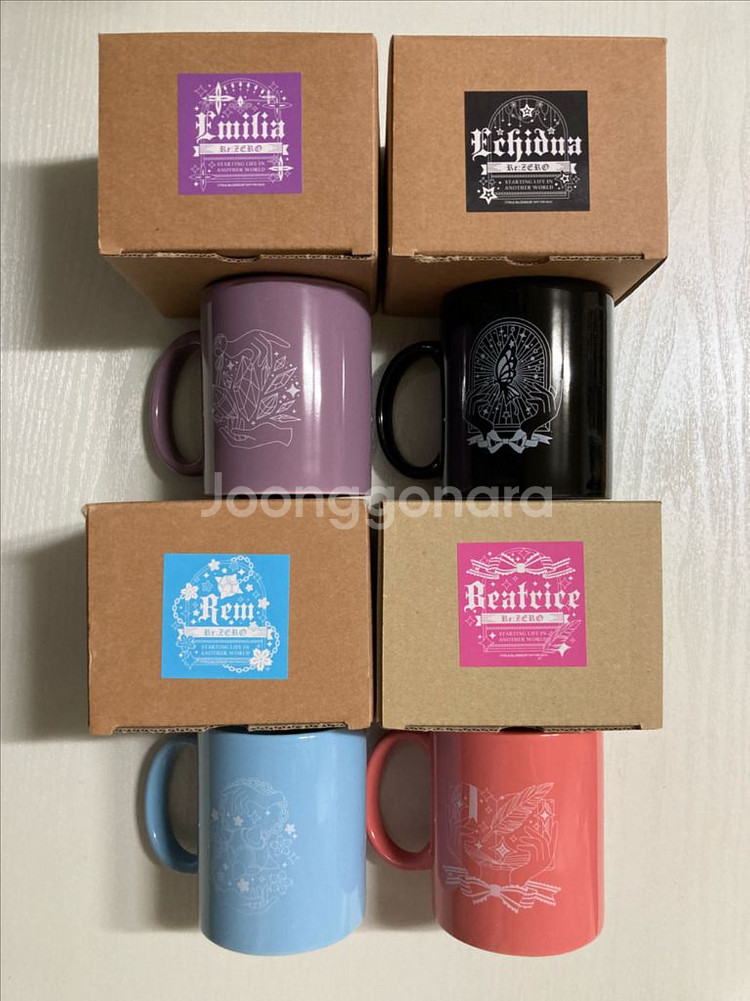※문의하시면 구매의사는 꼭 밝혀주시길 부탁드리겠습니다:) ※맨 마지막 사진과 프로필 공지사항 꼭! 읽어주세요. 적힌 가격은 전부 운미포 가격입니다. ㅡㅡㅡㅡㅡㅡㅡㅡㅡㅡㅡㅡㅡㅡ 리제로 애니플러스 콜라보 카페 굿즈 머그컵 전4종 = 세트로만 판매 / 택배비 포함 107,000원 구성: 에밀리아 보라색 머그컵, 에키드나 검은색 머그컵, 렘 하늘색 머그컵, 베아트리스 핫핑크색 머그컵 전부 미사용품입니다. 소장용으로 구비한 건데 컵들은 눈에 띄는 하자는 없습니다. 인쇄 상태도 되도록 좋은 걸로 소장하려고 해서 좋은 편입니다. 그래도 렘 머그컵은 인쇄 상태가 흐릿한 편이라 이 점은 감안하셔야할 것 같습니다. 박스의 경우 에밀리아 컵 박스 상태가 좋지 못합니다.(2장의 사진 참조) 이외 다른 박스에도 약간씩 찌그러짐 있습니다. 자세한 상태 사진은 문의하시면 찍어서 보내드립니다. 구매한 지 몇 년 많이 지나서 약간의 도색 벗겨짐이 있을 수는 있습니다. 예민하신 분은 거래를 피해주세요. 파손 방지를 위해 우체국 택배로만 거래합니다.