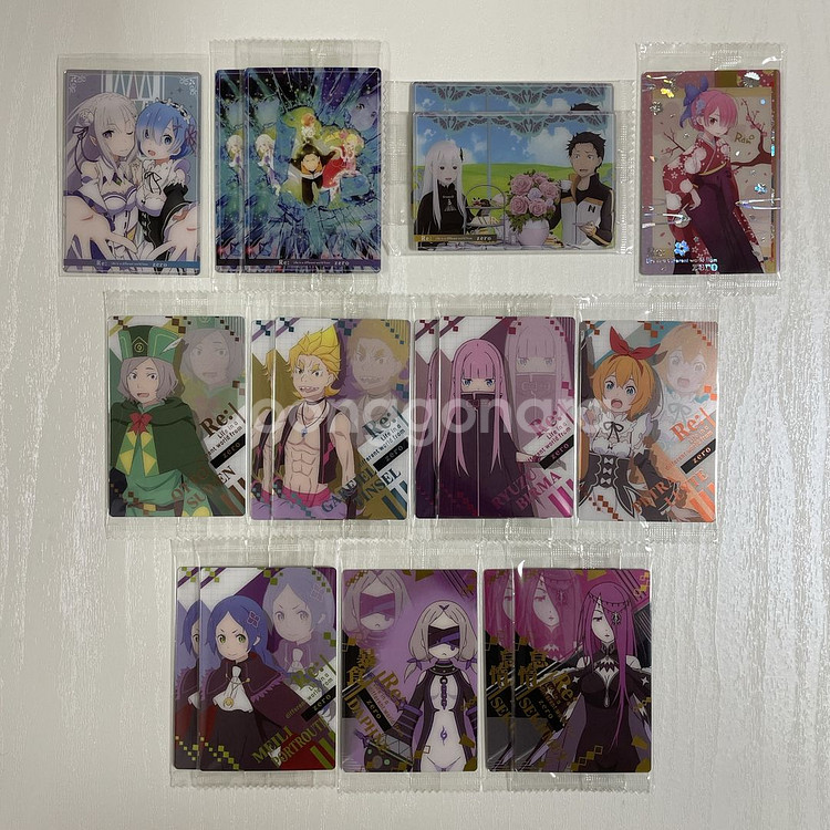※문의하시면 구매의사는 꼭 밝혀주시길 부탁드리겠습니다:) ※맨 마지막 사진과 프로필 공지사항 꼭! 읽어주세요. 적힌 가격은 전부 운미포 가격입니다. ㅡㅡㅡㅡㅡㅡㅡㅡㅡㅡㅡㅡㅡㅡ Re:제로부터 시작하는 이세계 생활 리제로 웨하스 카드 = 세트로만 판매 / 43,000원 (낱장 판매가 어렵고 일괄로 처분하고 싶어서 부득이하게 일괄로 판매하게 된 점 양해 부탁드립니다...) *왼쪽 위부터 지그재그식 순서대로 정열합니다* <3탄 카드 핀업 일러스트> 18. 에밀리아&렘 <4탄 핀업 일러스트> 19. 메인 비주얼 일러스트 / 3장 20. 에키드나 + 스바루 일러스트 / 2장 27. 람 기모노 일러스트 <4탄 캐릭터 카드> 6. 오토, 7. 가필, 8. 류즈, 10. 페트라, 11. 엘자, 12. 메일리, 15. 다프네, 17. 세크메트 <5탄 캐릭터 카드> 2. 에밀리아, 12. 라인하르트 반 아스트레아 전부 투명 비닐 미개봉품입니다. 그러나 웨하스 과자랑 같이 있었기 때문에 비닐 안쪽에 과자가루가 들어있을 수 있습니다. 상태에 민감하신 분은 거래를 피해주세요!! 구매하시면 카드 하나 당 웨하스 카드 봉지를 닦아 포장해서 보내드립니다.