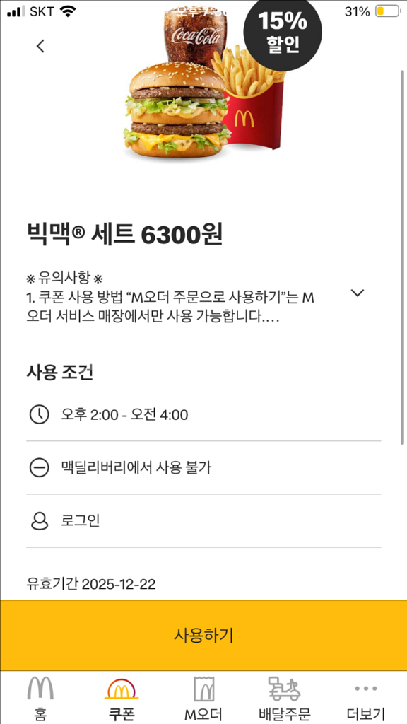 개인정보(거래정보)를 주고받는 행위는 사기에 노출될 수 있으므로 즉시 중고나라로 신고해 주세요맥도날드 빅맥 세트 6300원 할인쿠폰이에요. 유효기간이 2025년 12월 22일까지라서 빠른 주문이 필요해요!