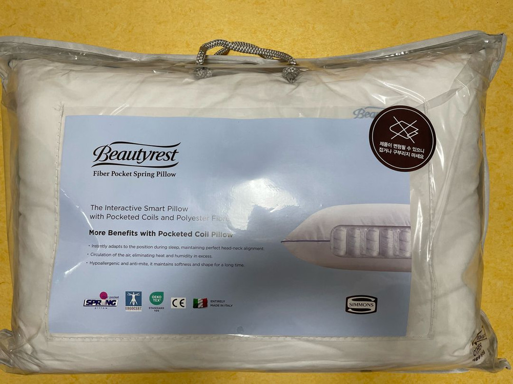 새상품인 시몬스 뷰티레스트 화이버 포켓스프링 베개 판매해요(비닐만 뜯어봤어요) (정가 230,000원) 사이즈는 약 70*50cm 겉감은 면 100%이고, 충전재는 포켓스프링, 폴리에스터, 폴리우레탄이요. 구매완료 후 반품,환불 불가이고요. 관심 있으시면 글 남겨주세요^^