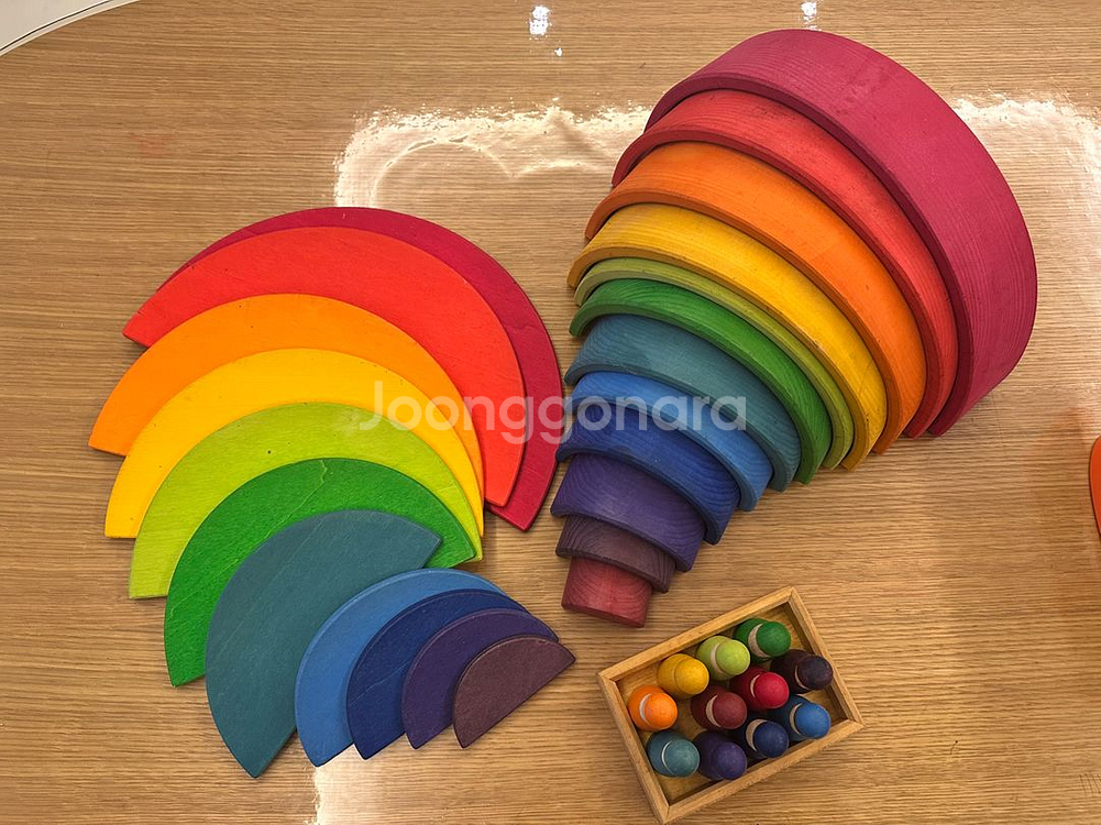 GRIMM'S 발도르프 교구 그림스 1. 빅레인보우 2. 쎄미서클 3. 프렌즈 (한 아이 분실) 입니다 사용감 생활기스 팬자국 있습니다 세트로 판매합니다