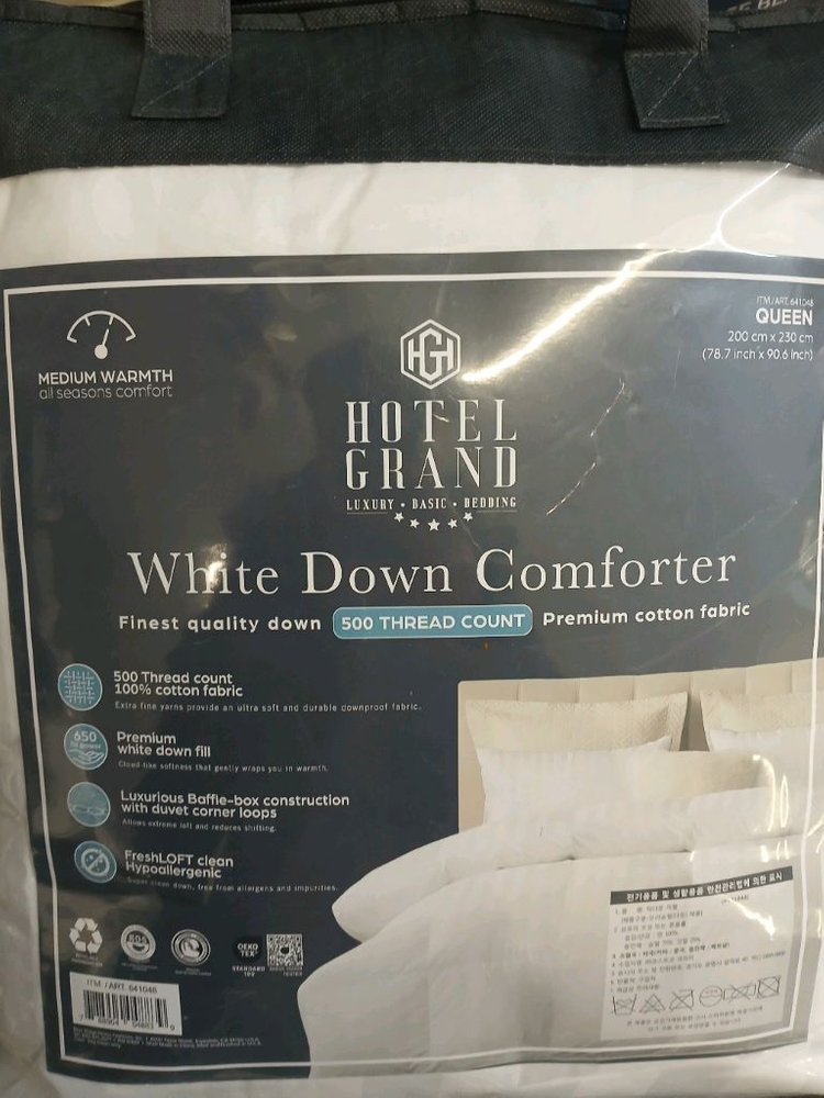 호텔 그랜드 화이트 다운 퀸사이즈 이불입니다 새상품이에요 겉감 안감 면 100% 충전재 오리털 75% + 오리깃털 25% - 500 스레드 카운트의 100% 면 소재로 제작되어 매우 부드럽고 내구성이 좋습니다 - 프리미엄 화이트 다운 충전재로 구름처럼 부드러운 촉감을 제공합니다 - 알레르기 유발 물질이 없는 FreshLOFT 클린 기술이 적용되었습니다