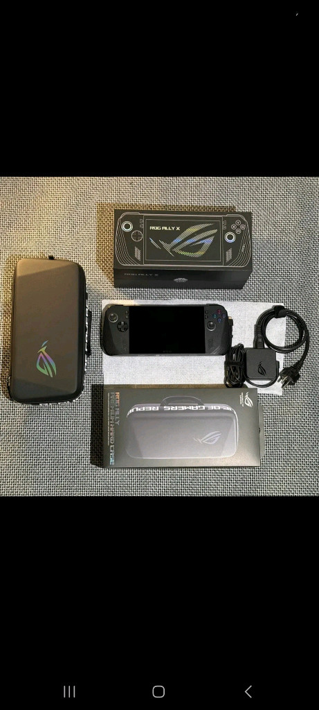 휴대용 게임기 1TB 모델이에요. 박스와 구성품이 모두 포함되어 있고 상태도 깔끔해 보입니다. 게임 좋아하시는 분께 추천드려요!