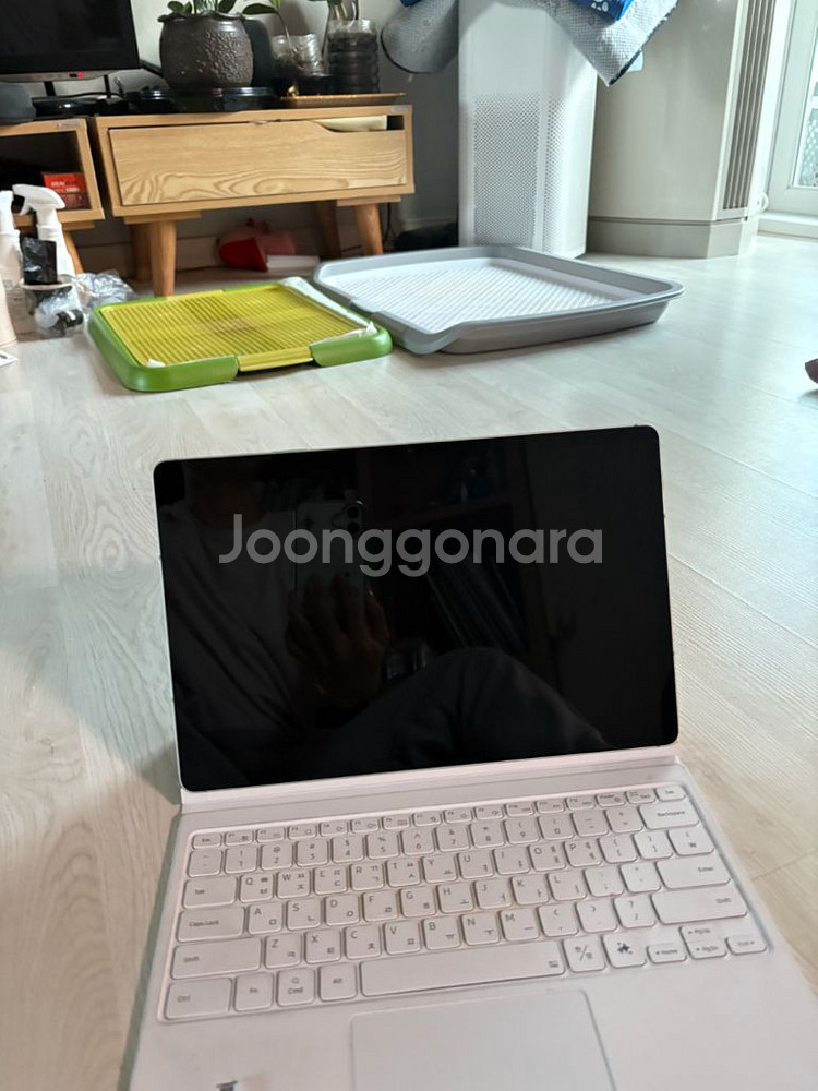 삼성 갤럭시탭 S9fe플러스민트 색상이에요. 키보드 커버도 함께 포함되어 있고, 전체적으로 깔끔한 상태입니다. 업무나 영상 시청용으로 좋아요! 20만원짜리 정품 키보드커버도 같이드려요