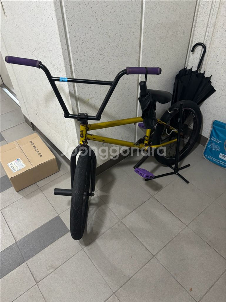 BMX 자전거입니다. 옐로우와 퍼플 컬러가 조화롭게 어우러져 있고, 사용감은 있지만 상태 양호해요. BMX 입문용으로 좋을 것 같습니다. 묻따15